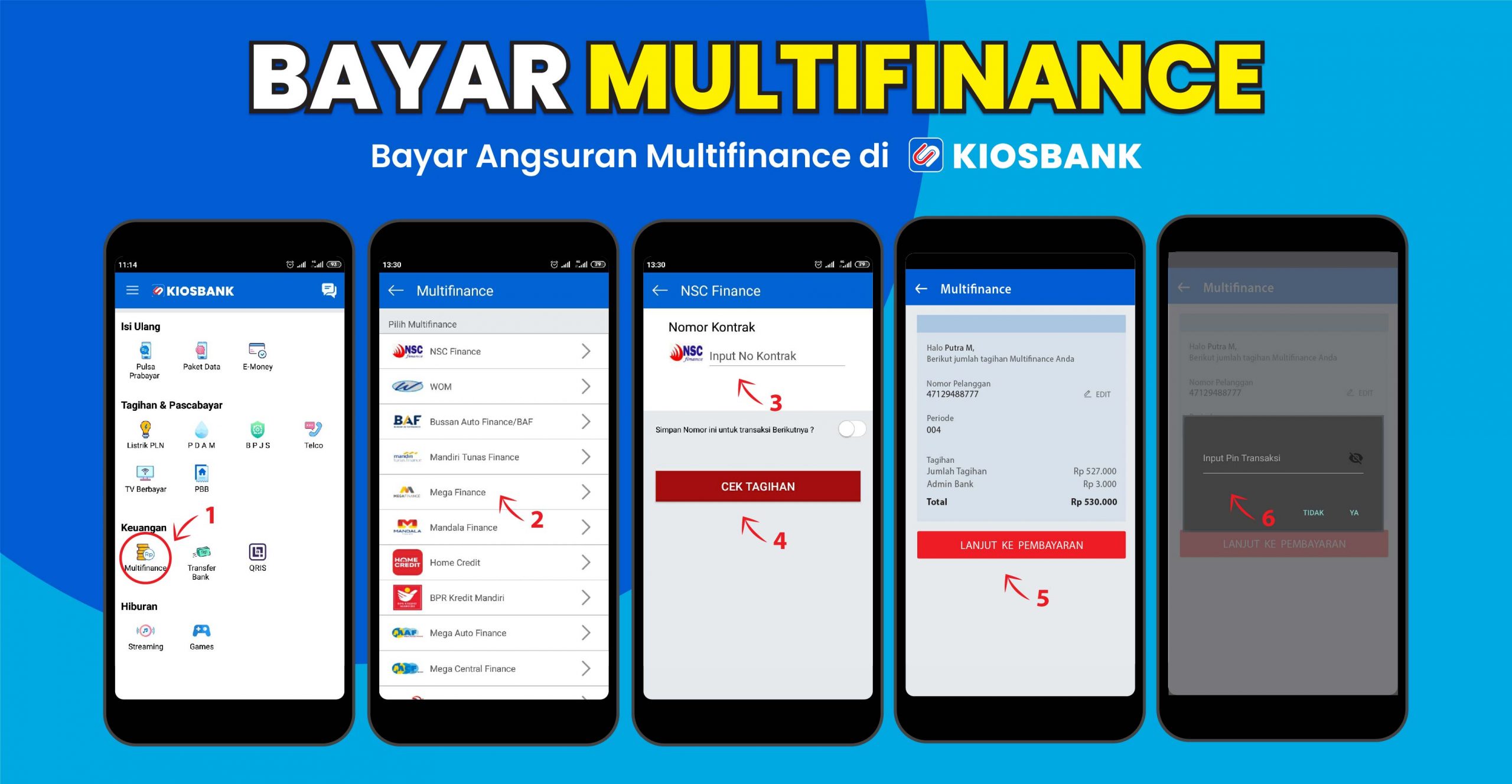 Bayar Angsuran Kredit Motor, Mobil ataupun Multifinance Makin Mudah Hemat dan Murah Bisa di Aplikasi Kiosbank. Saat ini mitra Kiosbank bisa melakukan pembayaran angsuran kredit motor dan multifinance milik pribadi ataupun untuk melayani pelanggan. Pilihan lembaga multifinance juga beragam, yaitu: FIF Group, NSC Finance, Smart Finance, WOM Finance, Mega Finanace, BAF, Mandiri Tunas Finance, Mandala Finance, Adira Finance dan lainnya.