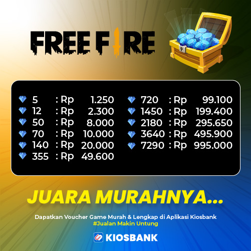 Top Up Free Fire FF Diamond Voucher Game kini bisa di Kiosbank. Produk baru voucher game ini untuk memudahkanmu dalam melakukan pembelian item-item Free Fire bagi kamu pemain game Free Fire. Mainkan game terbaru Free Fire dan jadilah pemain terbaik dengan top up Free Fire. Saat ini Kamu dapat memainkan game Free Fire lebih menyenangkan dan seru dengan membeli item games lengkap.