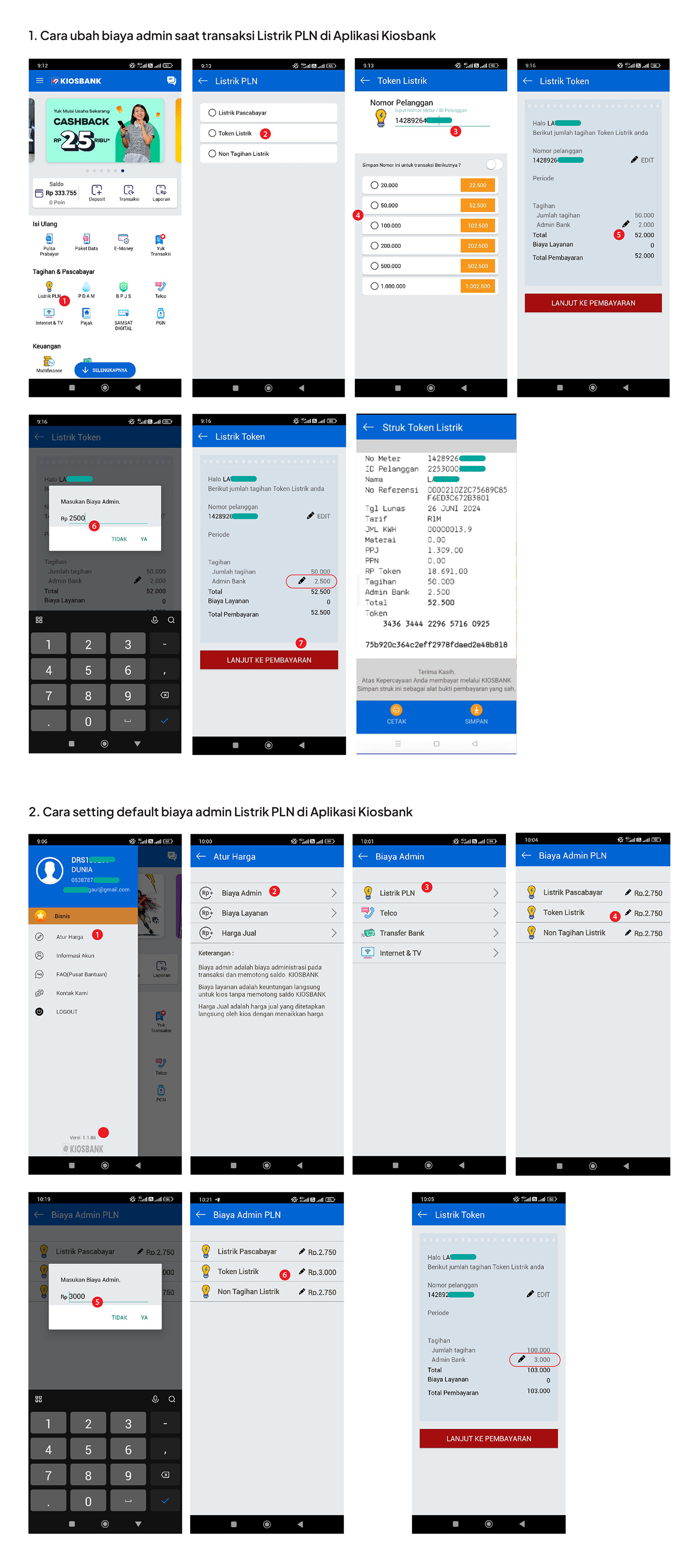 Biaya Admin Bank transaksi Listrik PLN akan memotong saldo Kiosbank. Jika biaya admin dinaikkan maka komisi untuk penjual akan bertambah pula dan diberikan saat pembagian fee diawal bulan berikutnya, begitu juga sebaliknya. Berikut ilustrasi perhitungan biaya admin bank yaitu: